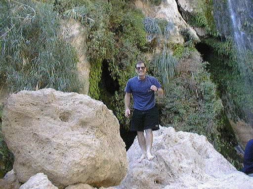 Avigail at the base of the falls, water gushing from all over.