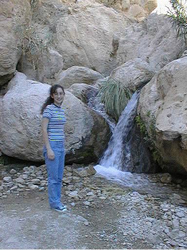 Avigail at the base of the falls, water gushing from all over.