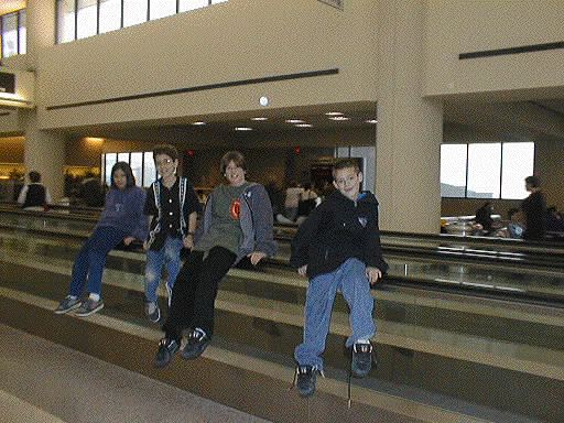 and riding the moving walkway.